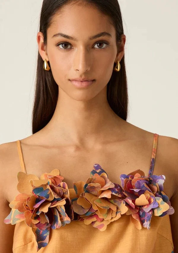 Captivating with both colour and design, this top flaunts a vibrant floral print, which it complements with floral fabric embellishment through the front of the neckline. Using a lightweight linen blend to create a relaxed silhouette that flares towards the hem, the top balances this up top with barely-there straps at the shoulder.