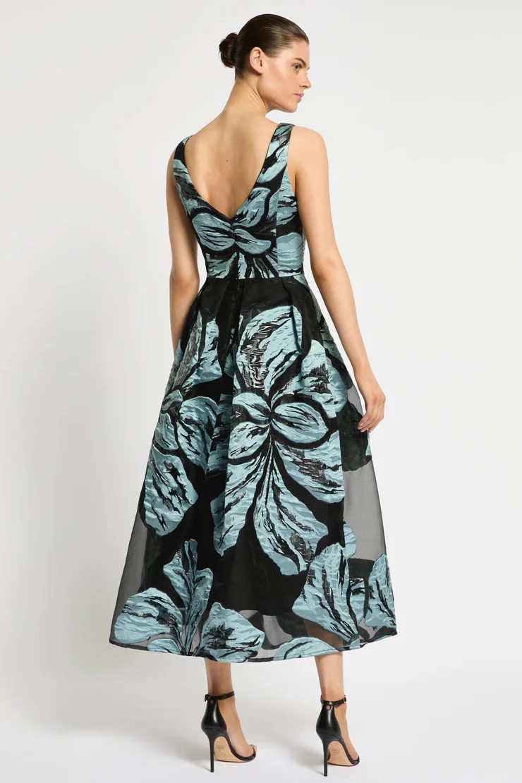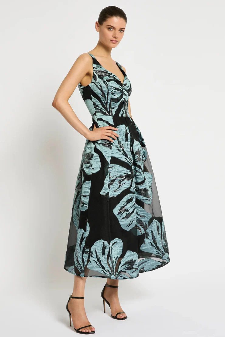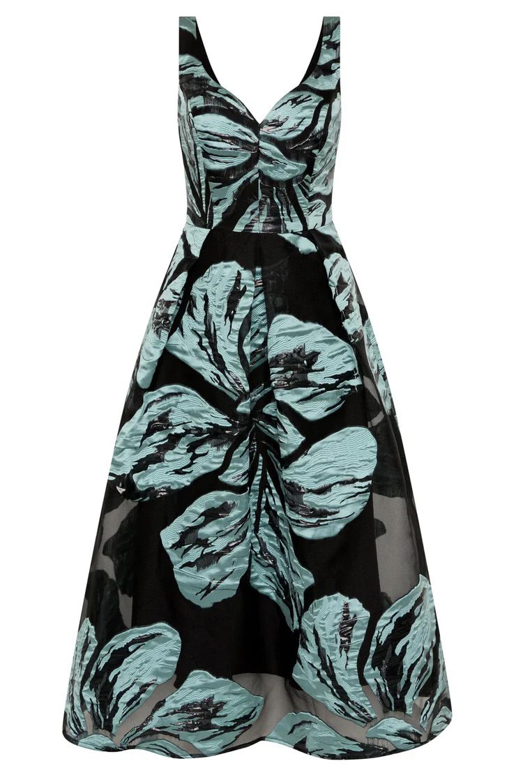 The Bella Midi’s mint blue floral design with metallic highlights is crafted on a contrasting black organza jacquard and is meticulously placed to flatter the body. It features a sweetheart neckline with structured bodice panelling and a waist seam, falling to an A-line skirt and finishing at midi length. This classic A-line silhouette is fully lined with an inverted pleat at centre front. A standout piece for any cocktail or black-tie event.