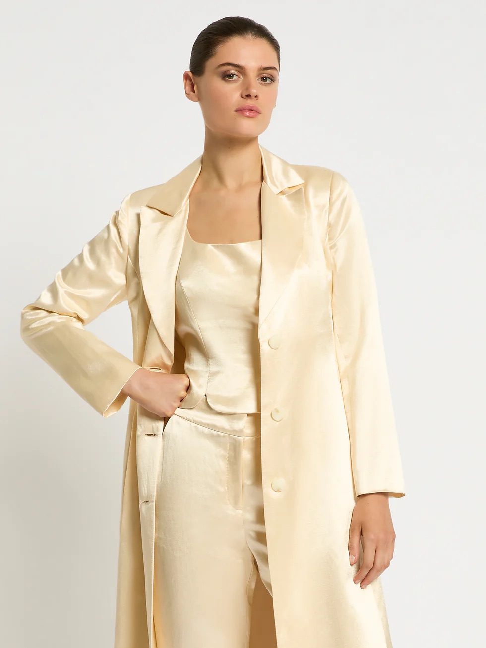 An elevated classic, the Bianca Trench is tailored from a luxurious sateen linen-viscose blend, offering both drape and refined structure. Panelled to create a slim, feminine silhouette, it features subtle shoulder pads for added definition and a strong, tailored finish. This full-length trench fastens through the centre front with covered buttons and is detailed with discreet jet pockets. Fully lined in stretch satin, it allows for smooth layering and ease of movement. Wear it layered over the Bianca Bustier and Christabel Skirt for an elegant formal ensemble, or pair with the Bianca Bustier and Bianca Pant for a polished yet versatile look.