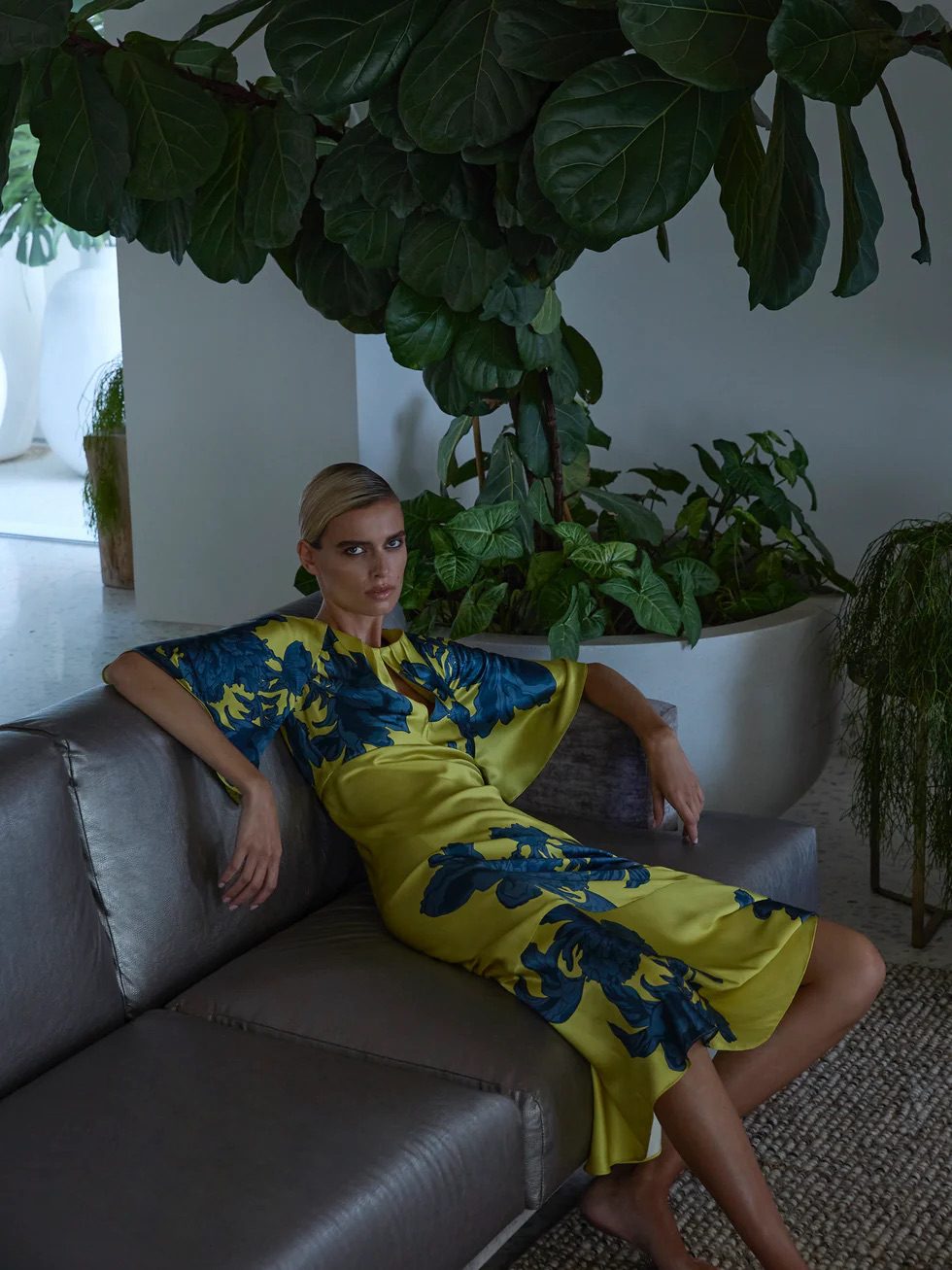 Make a statement with the striking silk Delphine Midi featuring a vibrant citrus backdrop adorned with a digital floral design in tonal shades of blue. This summer midi dress features tuck detailing and a keyhole neckline with an under bust seam that flows into an A-line bias-cut skirt with a flounce hem. Elbow length flounce sleeves add a soft, feminine touch to this elegant style.