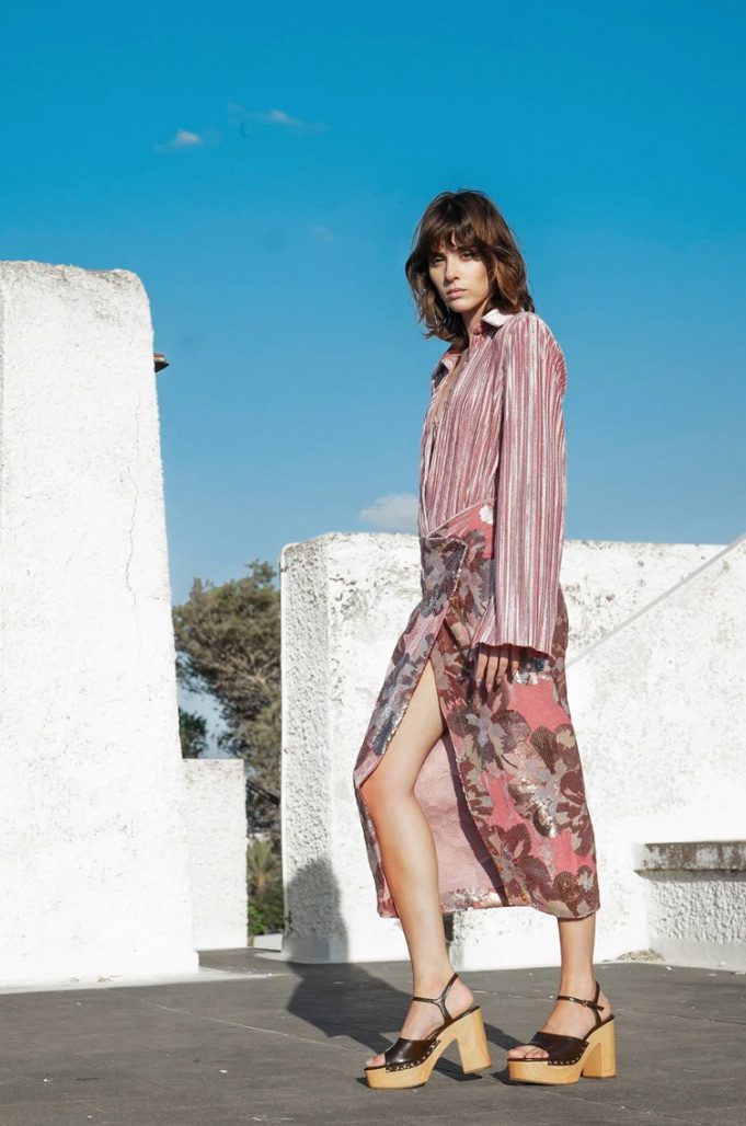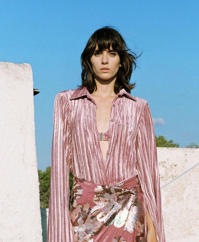 Pleated velvet top with a collar and long sleeves with slit, and button closure at center front.