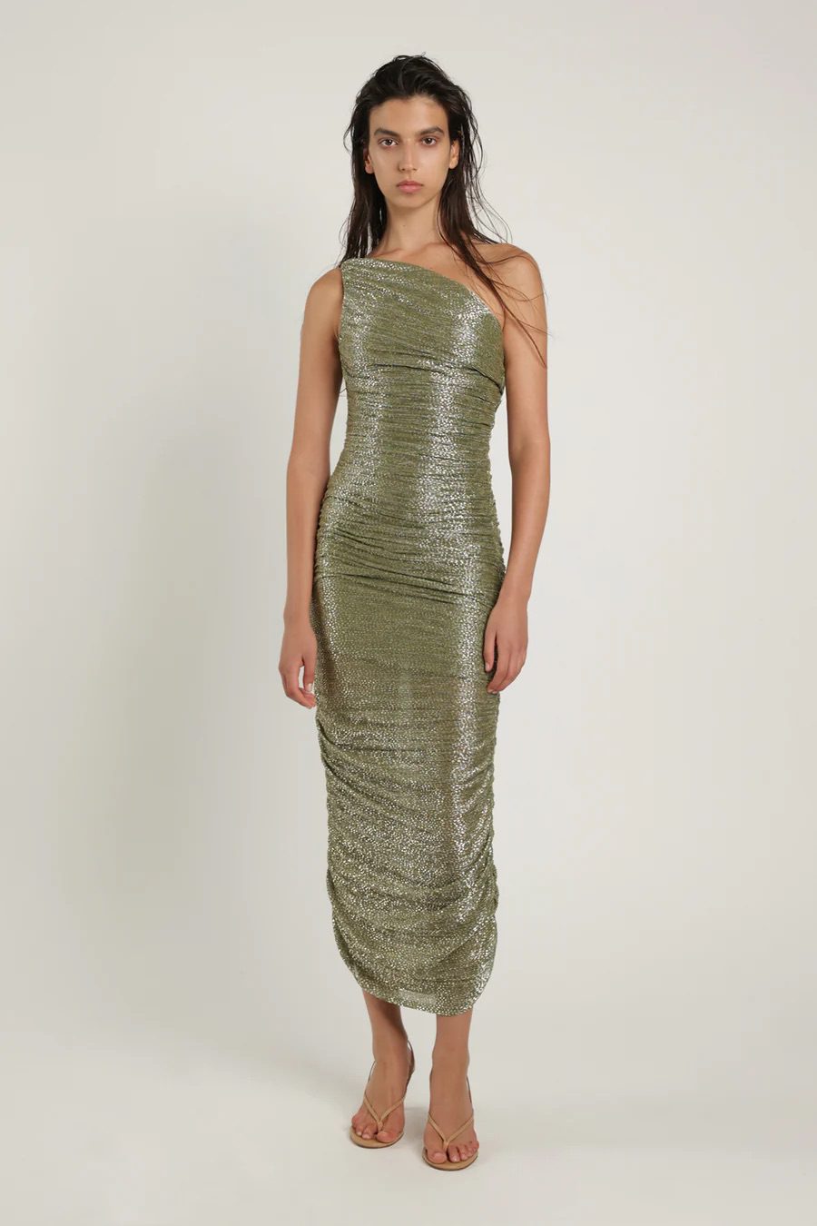 Pleated knit with speckled foil midi dress with an asymmetric neckline, and gathering detail on the sides.