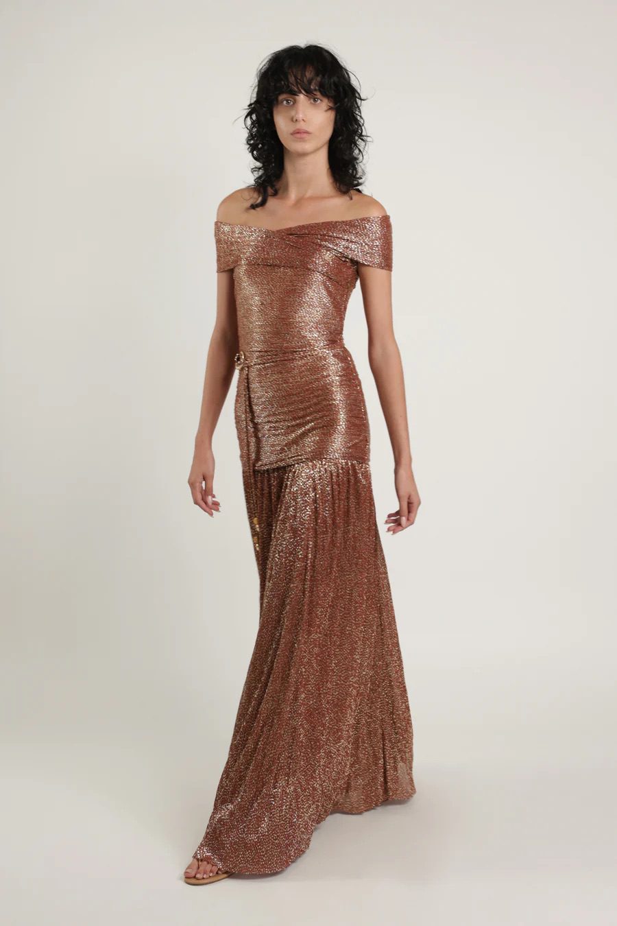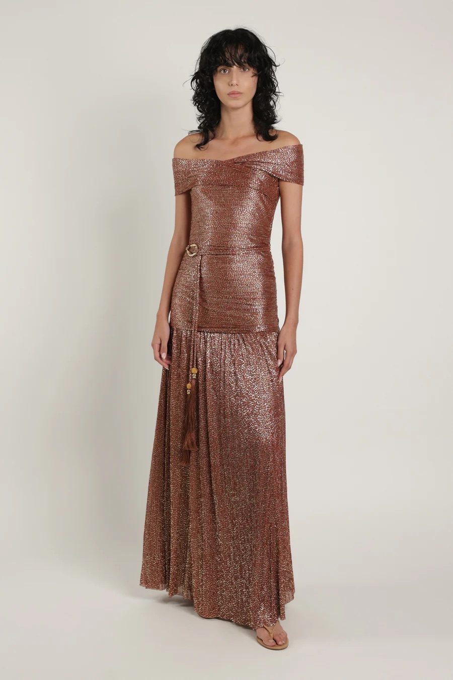 Pleated knit with speckled foil off-the-shoulder maxi dress featuring twisted front detail, and gathering detail at the waist.